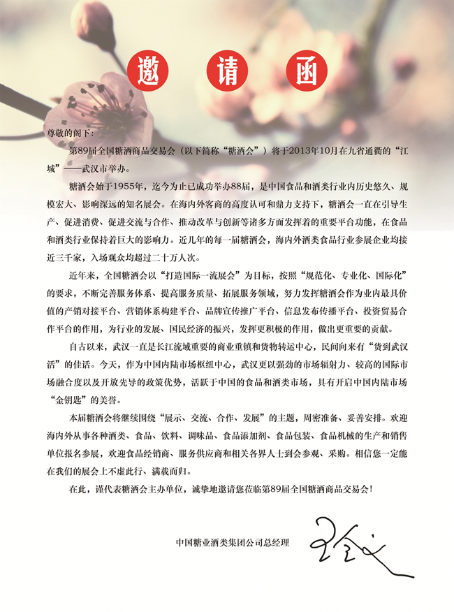 尊敬的阁下: 第89届全国糖酒商品交易会(以下简称“糖酒会”)将于2013年10月在九省通衢的“江城”——武汉市举办。 糖酒会始于1955年,迄今为止已成功举办88届,是中国食品和酒类行业内历史悠久、规模宏大、影响深远的知名展会。在海内外客商的高度认可和鼎力支持下,糖酒会一直在引导生产、促进消费、促进交流与合作、推动改革与创新等诸多方面发挥着的重要平台功能,在食品和酒类行业保持着巨大的影响力。近几年的每一届糖酒会,海内外酒类食品行业参展企业均接近三千家,入场观众均超过二十万人次。